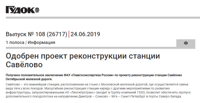 Savelovo is the most important station located at the junction with the Moscow railway, where the type of traction is changed for all trains. The large-scale reconstruction of the station, along with other measures for the development of infrastructure, projected by JSC Lengiprotrans (part of the 1520 Group of Companies), will allow the passage of additional train traffic on the Dmitrov — Sonkovo — Mga — St. Petersburg direction to the ports of the North-West.