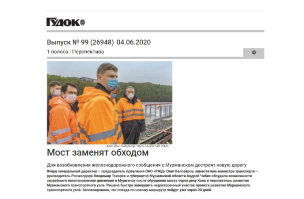 June 3, Oleg Belozerov, CEO and Chairman of the Board of Russian Railways, Vladimir Tokarev, Deputy Minister of Transport and Head of Roszheldor, and Andrei Chibis, Governor of the Murmansk Region, discussed the possibility of an early restoration of traffic to Murmansk after the collapse of the bridge across the Kola River and the prospects for the development of the Murmansk transport hub. It was decided to quickly complete the unfinished section of the Murmansk transport hub development project. It is planned that the trains on the new route will go in 20 days.